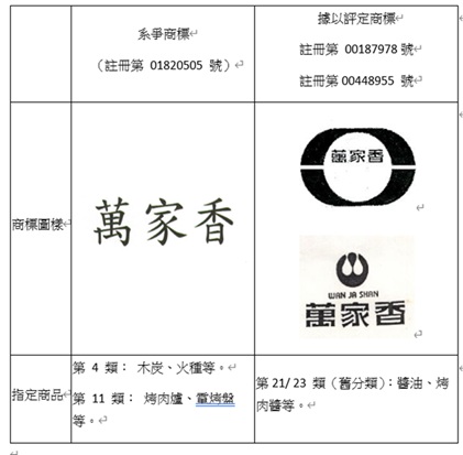| 一、 | 萬家香醬園股份有限公司(以下簡稱萬家香公司)自民國72年起推廣著名廣告詞「一家烤肉萬家香」,將品牌與烤肉活動深度連結,「萬家香」商標經法院認定已為「國內絕大多數消費者普遍認知」之高度著名等級,A公司以「萬家香」商標指定在木炭、烤肉爐等商品,遭萬家香公司提出評定,智慧局作出A公司「萬家香」商標撤銷之處分,訴願及行政訴訟階段皆維持原處分。 | |||