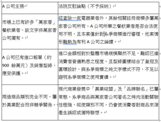 | 法院審酌A公司於訴狀中自承知悉萬家香公司之廣告影響力,卻刻意選擇與萬家香公司著名廣告標語「一家烤肉萬家香」高度關聯之器材(烤肉爐、木炭)申請註冊。法院認定此舉顯非巧合,具備仿襲著名商標聲譽以獲取不正利益之惡意。 | ||||