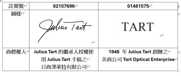 考量到Julius Tart實際上是「Tart」的創辦人,而且兩商標同樣使用在眼鏡上,品牌定位一樣是高端時尚眼鏡,產品風格一樣是經典手工復古鏡框,要說相關消費者看到「Julius Tart」,會不聯想到「Tart」,的確是相當牽強。